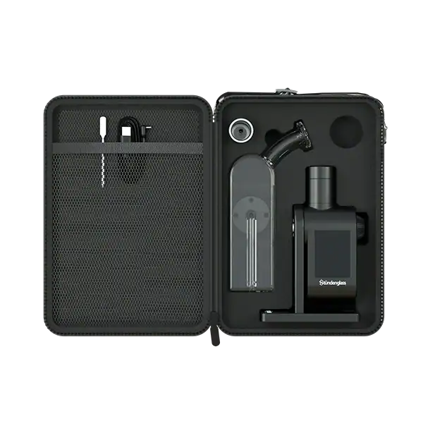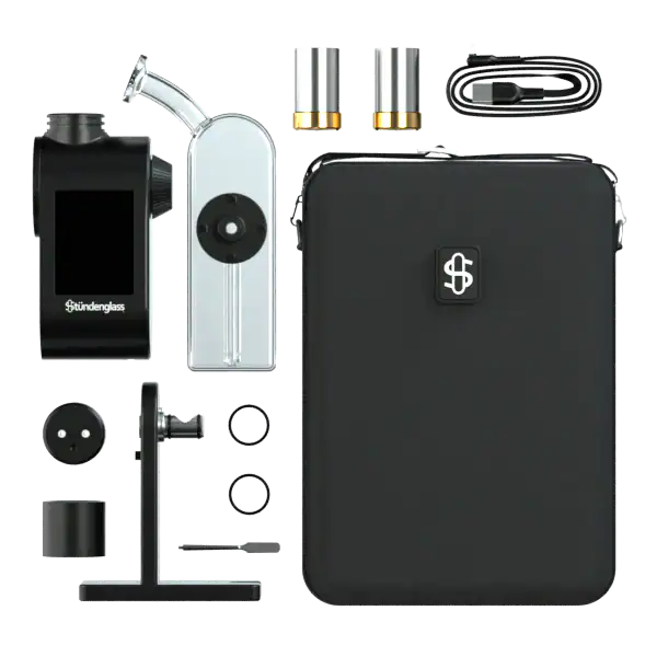 Το Deluxe Travel Set περιέχει ένα Stündenglass Modül, ένα Dok με διαφανές γυαλί και δεξαμενές Modül για ξηρό υλικό και συμπυκνώματα, όλα σε μια υψηλής ποιότητας, αδιάβροχη τσάντα μεταφοράς.